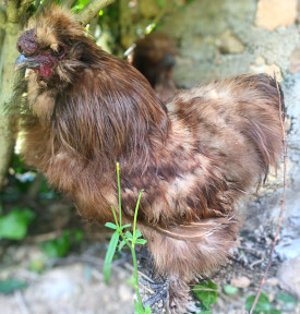 - Le second est le gène « choc » c’est le gène qu’on trouve le plus souvent sur la Poule Soie chocolat. Il a été introduit dans la race il y a une dizaine d’années. C’est un gène lié au sexe issu de l’Orpington (naine). Le coloris obtenu est appelé chocolat, on entend aussi parler de Carefoot. Pour les Poule Soie naine, c’est ce même gène qui est présent, mais il a été introduit par croisement avec la Sérama.