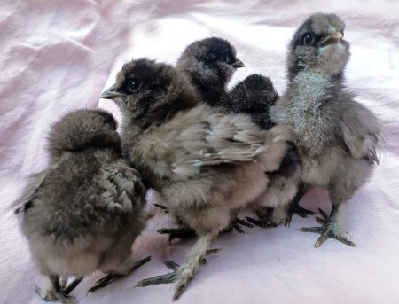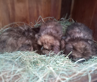 Dès la naissance, les poussins Poule Soie chocolat sont identifiables grâce à la teinte de leur duvet « chocolat ». Ils peuvent parfois avoir des taches blanches, principalement au niveau de la tête et de la poitrine. Ces taches disparaissent vers un mois et demi / deux mois.
