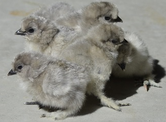 Les poussins naissent de couleur gris clair. Comme pour les adultes, les poussins gris perle auront un coloris très lumineux. Attention car on peut facilement les confondre à la naissance avec des poussins splash ou bleu très clair.La peau, les yeux, le bec et les ornements seront noirâtres.