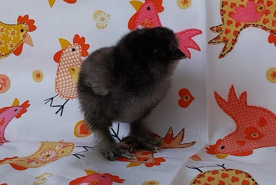 La peau, les yeux, le bec et les ornements naissants seront noirs et donc conformes au standard des sujets noirs adultes. Il n’y a pas grand-chose à dire sur les poussins noirs, sinon qu’ils seront intégralement noirs. Le sous-plumage sera également bien noir.Le blanc dominant et le blanc récessif sont génétiquement différents, mais il est impossible de faire la différence au visuel sur les poussins.