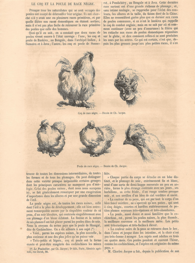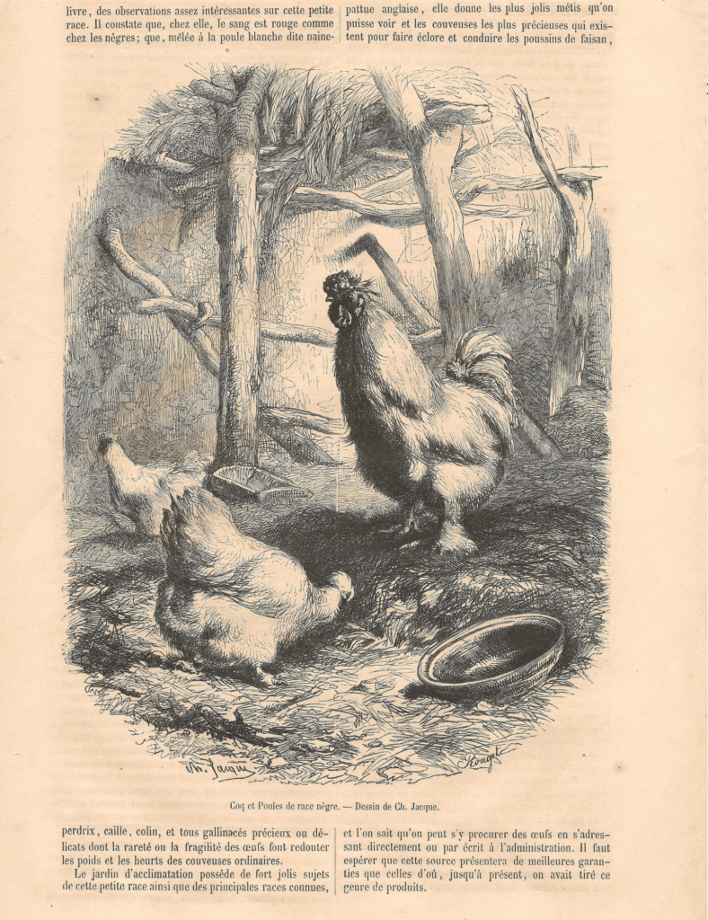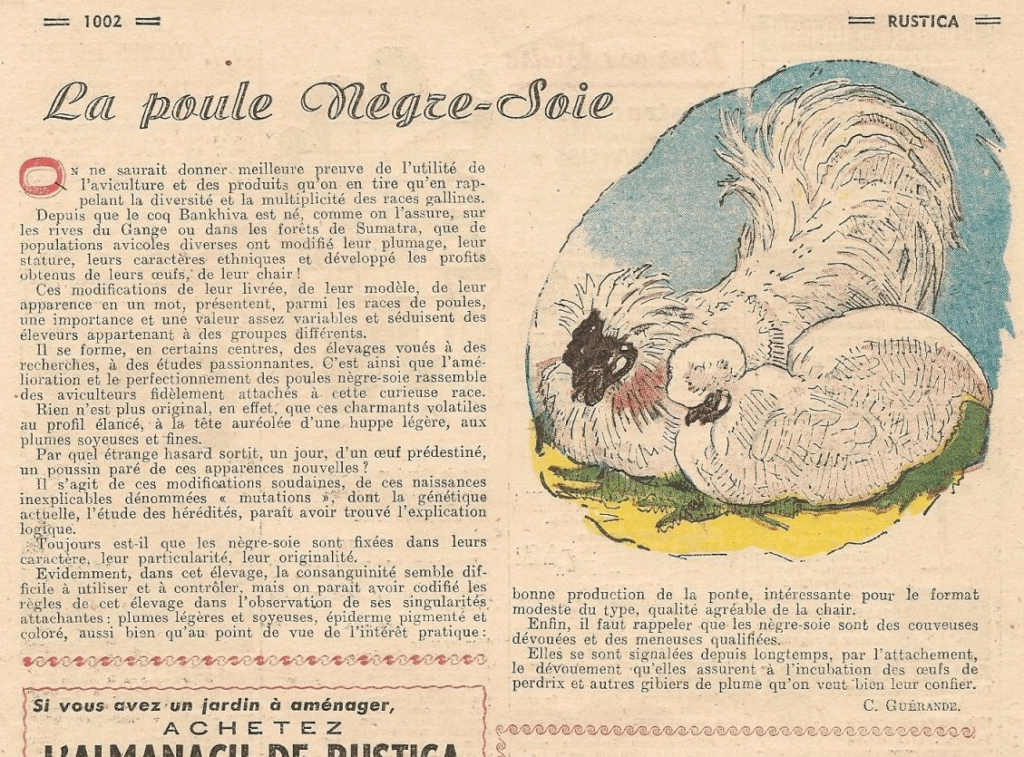 Nombreux sont ceux qui pensent que la Poule Soie est une race relativement moderne dans notre pays. Il n’en est rien. Le 4 décembre 1949, la « nègre-soie » est déjà présentée  dans le magazine RUSTICA comme une curieuse race aux plumes soyeuses et fine. Il existe également de nombreux croquis ou images d’archive où la Poule Soie est représentée.
